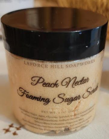Experience the sweet, juicy freshness of summer with our Peach Nectar Foaming Sugar Scrub from LaForce Hill Soapworks. This luxurious scrub combines the fragrant, fruity scent of ripe peaches with a gentle sugar exfoliant, leaving your skin feeling smooth, soft, and beautifully nourished.