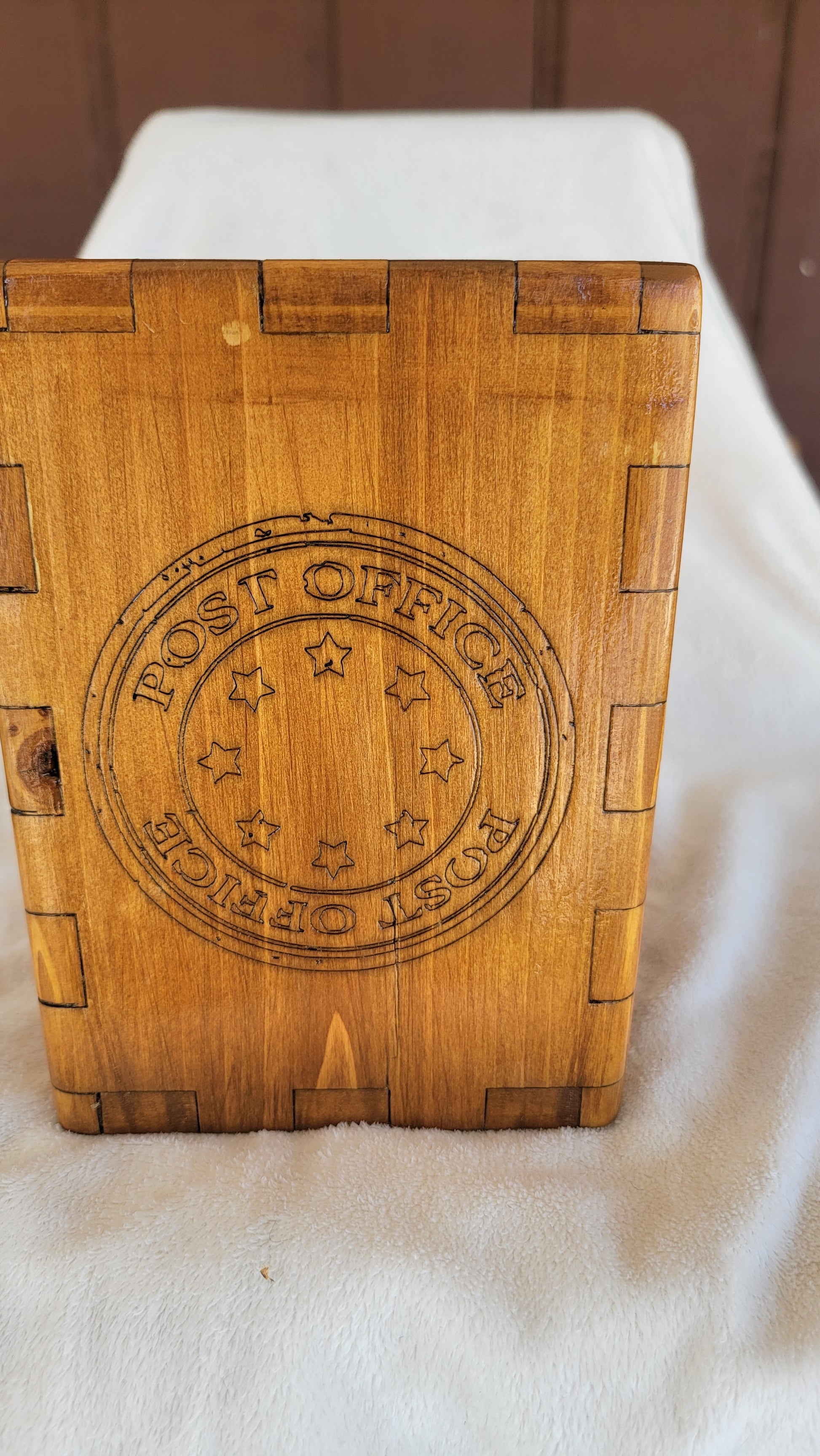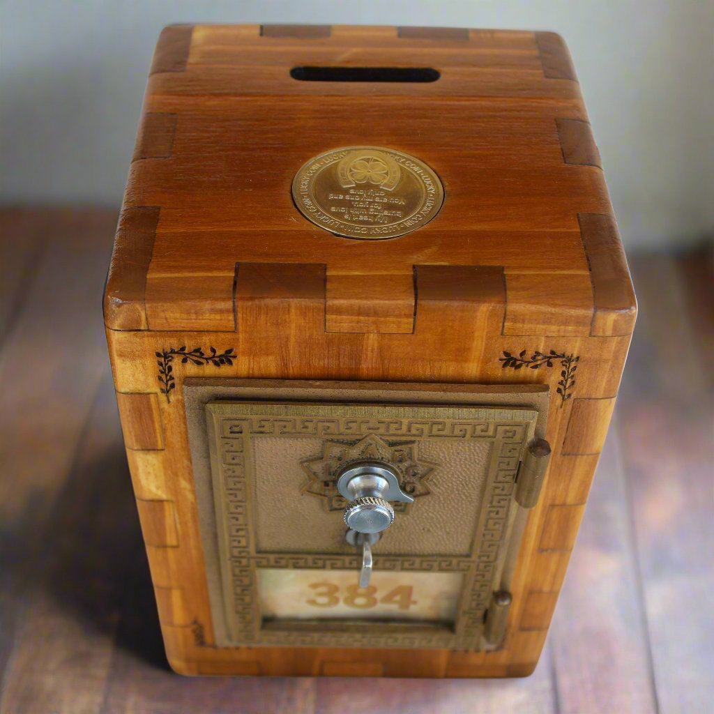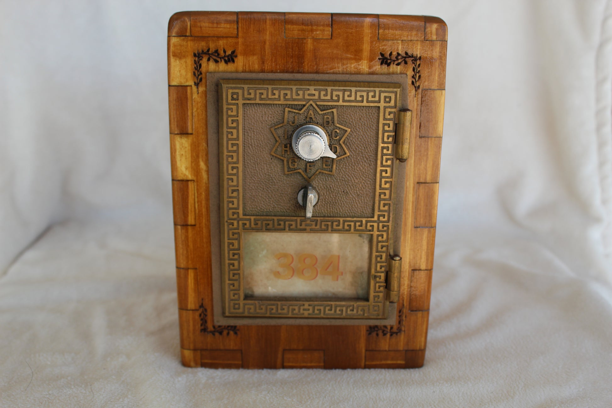 This handcrafted vintage PO box door bank is a beautiful and functional piece of nostalgia, perfect for collectors or anyone looking to add a unique touch to their home decor. Featuring an authentic vintage post office door with a single combination lock knob, it adds a charming old-world feel while keeping your coins secure. The bank includes a convenient coin slot for easy deposits, and the interior is lined with soft felt to protect your collection. Whether for display or everyday use, this one-of-a-kind piece offers a blend of craftsmanship and history.